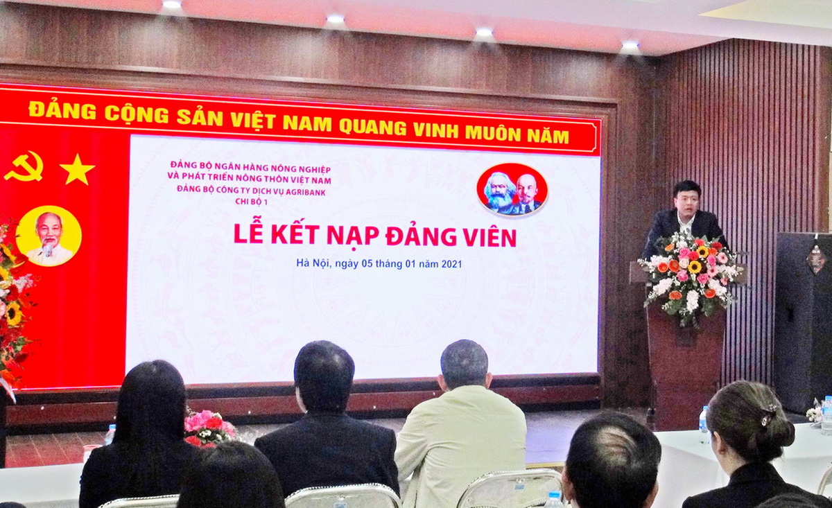 Chiều ngày 05 tháng 01 năm 2021 tại Hội trường Công ty Dịch vụ Agribank, được sự đồng ý của Đảng ủy, Chi bộ 1 tổ chức Lễ kết nạp Đảng viên mới cho Đồng chí Nguyễn Thị Bình và trao Quyết định công nhận Đảng viên chính thức cho đồng chí Vũ Công Định.